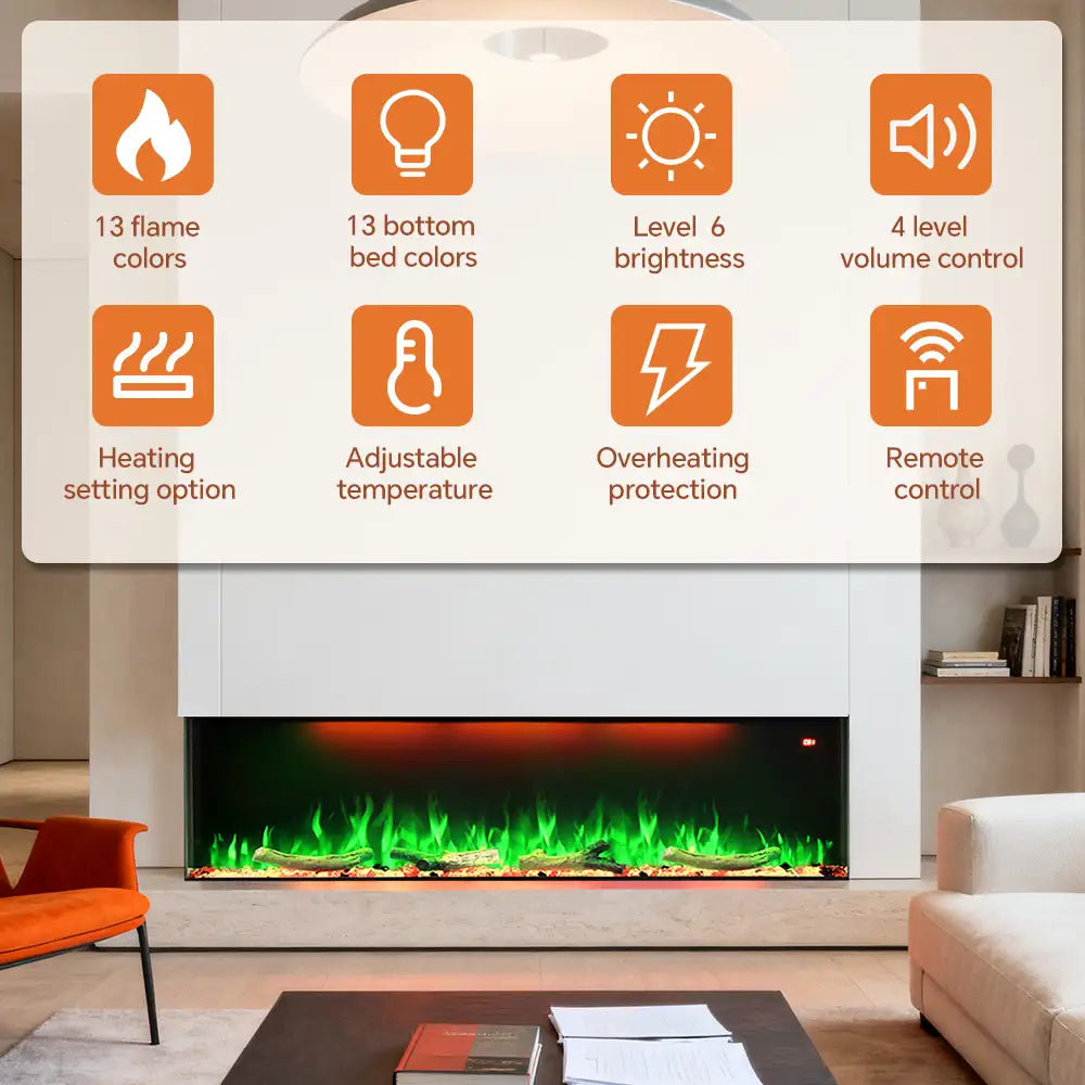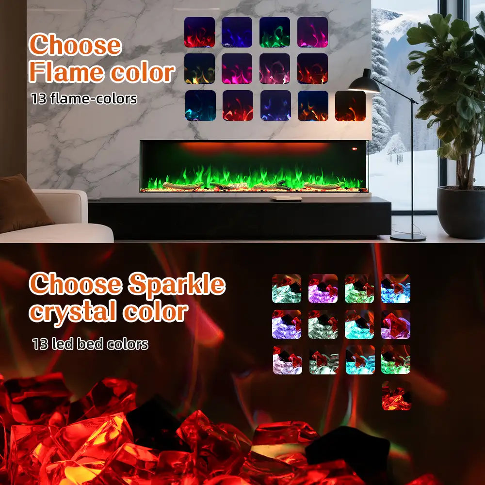 • 13 flame colors and 13 log bed color options