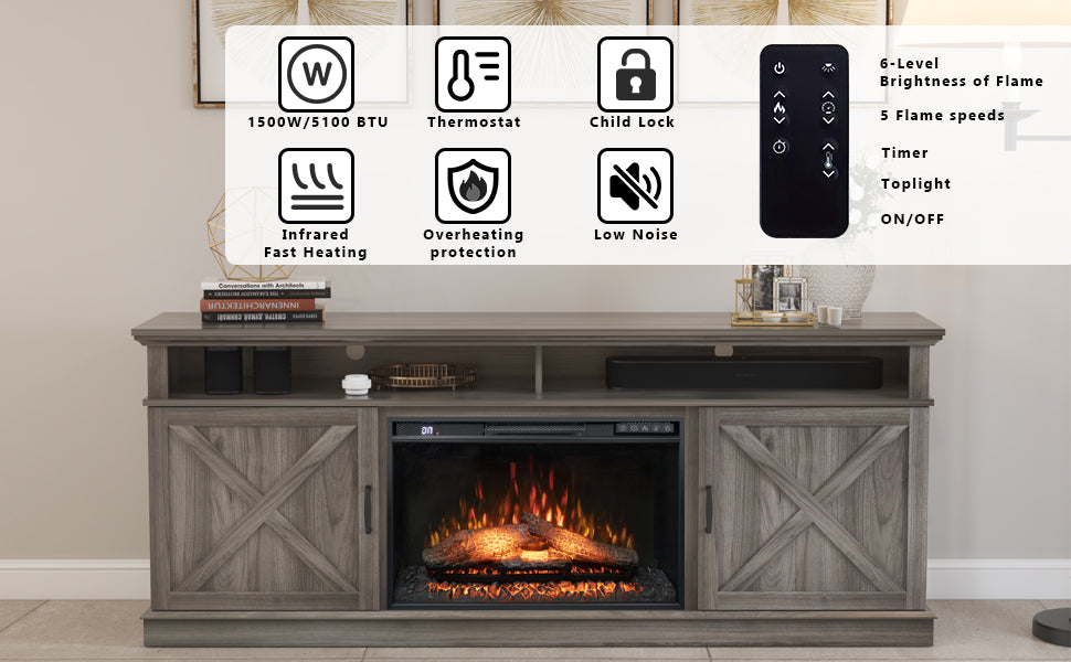 • Sturdy & Durable Material:This tv cabinet adopts high-quality MDF board, the finishes are waterproof and scratch-proof, and can hold up to 200 pounds. Fine and durable assembly parts make assembly easy. The frame of the fireplace heater is made of black sturdy metal, and the tempered glass panel proctects the logs well.